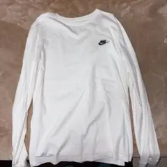 Nikeのシンプルなホワイト長袖カットソー、ロゴデザインが特徴。