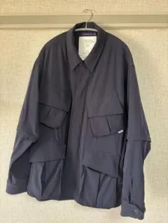 オリーブグリーンのコットン製ジャケット、コーデュロイ襟付きでフロントポケットあり。