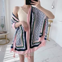 柔らかい素材のグレーのストール、フリンジ付きでカジュアルなスタイルに最適。