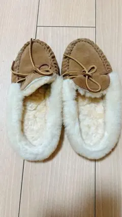 スエード素材のブラックモカシン、フリンジ付きリボンデザイン。