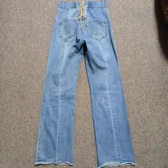 ライトブルーのストレートレッグデニム、ジッパーフライ仕様。