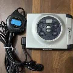 シルバーのKENWOOD製ポータブルMDプレーヤーDMC-P33、ボリューム調整やホールド機能付き。
