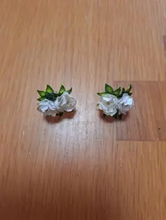 緑色の樹脂製ピアスに花が埋め込まれたユニークなデザイン。