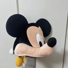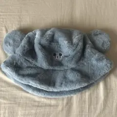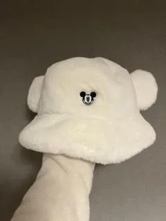 ミッキーマウスの刺繍が施されたピンクのファー素材の帽子、サイズ58cm。