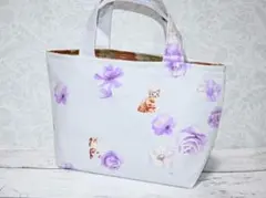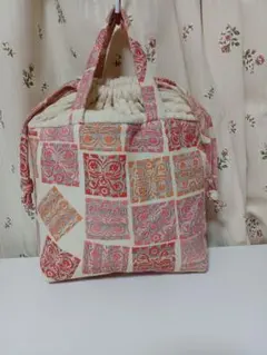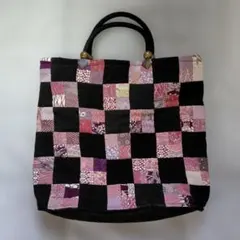 パッチワークデザインのトートバッグ、内側にイラストプリントあり。