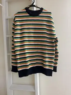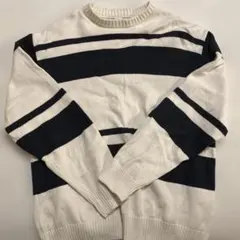 ネイビーとホワイトのストライプデザインのニットセーター、サイズS。
