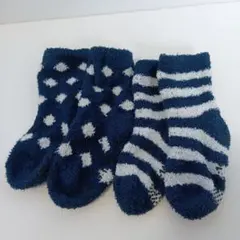 青と白の雪の結晶デザインの靴下、ミドルタイプ、2足組、サイズ16-18cm。