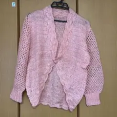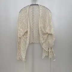 透かし編みデザインのベージュカーディガン、オープンフロントスタイルで軽やかな着こなしに最適。