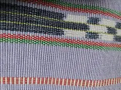 赤系に茶色、芥子、抹茶、オレンジなど。ミンサー特有の男女をあらわした絣。