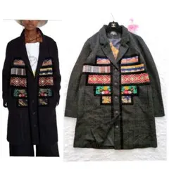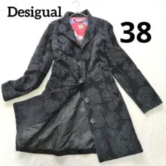 極美品 Desigual 刺繍混チャイナ調Aラインロングコート ジャガード 総柄