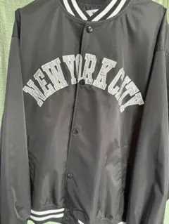 刺繍入りのネイビーのスタジャン、サイズ39、ストライプ襟デザイン。