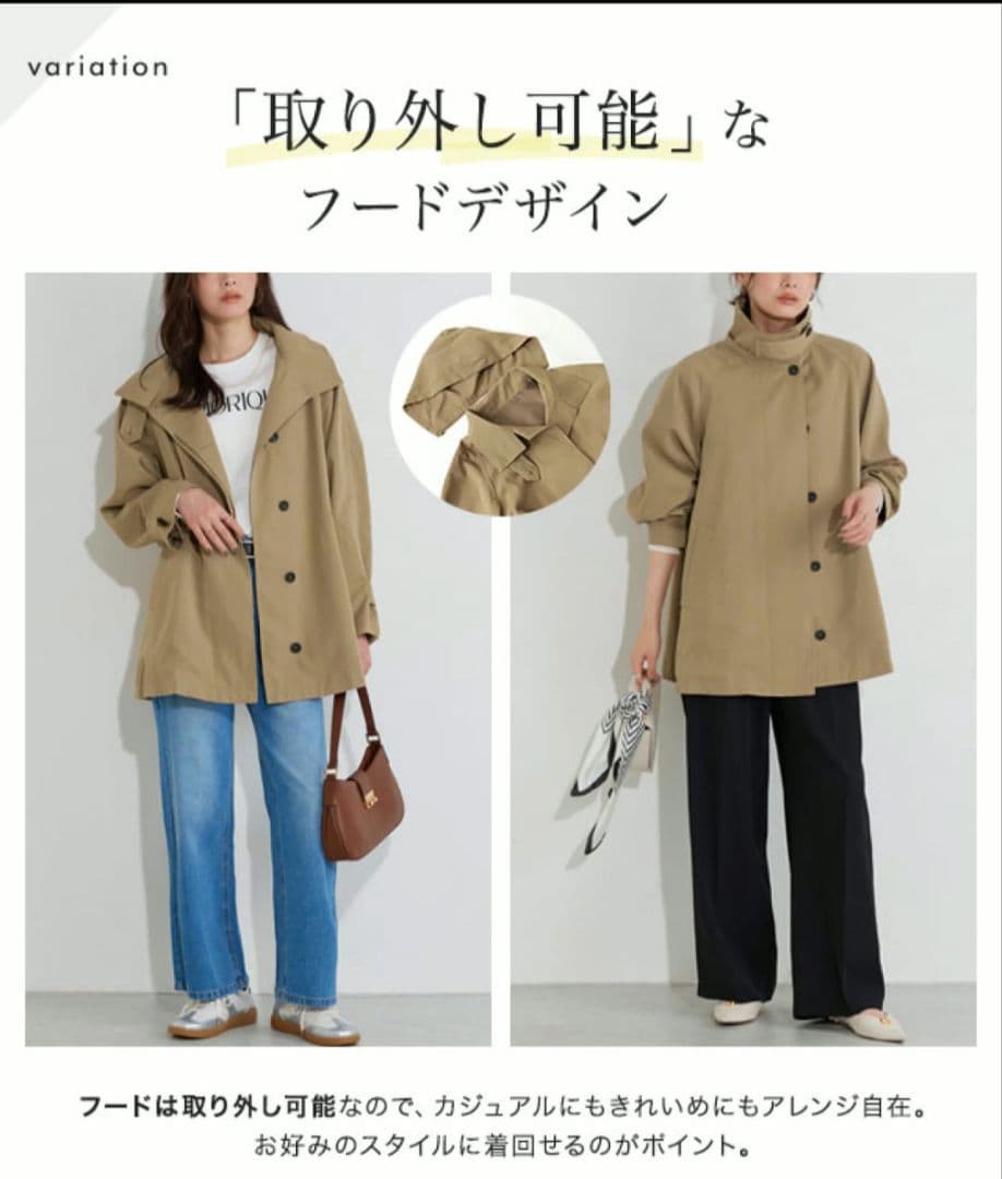 ポンチョのようにふんわり広がるAラインシルエットが、今っぽさを演出。腰回りやヒップを自然にカバーし、スタイルアップ効果も期待できます。フードはファスナーで取り外し可能なので、カジュアルにもきれいめにもアレンジ自在。着こなしの幅が広がるアイテムです。