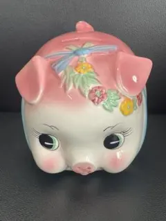 陶器製 ブタの貯金箱 花柄デザイン 置物 レトロ