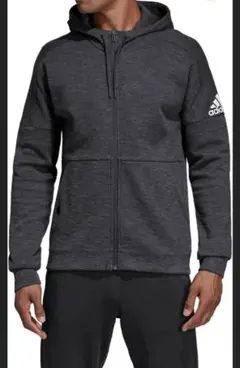 adidasのフルジップフード付きパーカー、シンプルなグレーのデザイン。