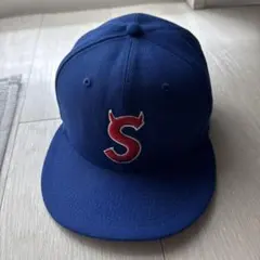 ストライプデザインのホワイト/ブルーキャップ、刺繍のSロゴ付き。