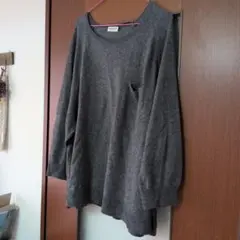 リブ編みのグレーのタートルネックニット、長袖で暖かいデザインです。