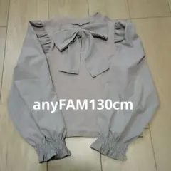 any fam の長袖のタートルネック、サイズ表記は140ですが、タグには130〜140とあります。よく見ると地模様のある素材にピンクと白の細かいボーダー柄でとてもかわいいです。胸のリボン付きロゴもおしゃれです。タグもよれていませんし、そこまで着用しなかったと思います。宜しくお願いします。