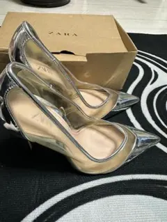 グリーンのスリングバックパンプス、金色の装飾が特徴。