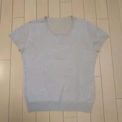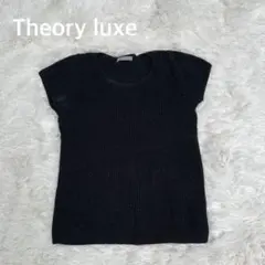 Vネックデザインのラメ入り黒い半袖ニット、ギャザーが特徴。