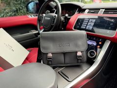 幾何学模様のストラップとフロントポケットを備えた、メッシュ素材のショルダーバッグ。