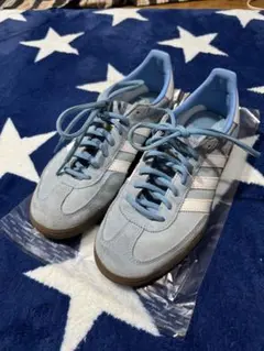 ネイビーとライトブルーのスエード素材のadidas Spezialシューズ、ゴムソールで耐久性あり。