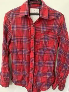 チェック柄のネイビーとレッドの長袖シャツ、胸ポケット付き。