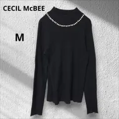 セシルマクビー リブニット カットソ花刺繍 ショート丈 フレアスリーブ 黒 M
