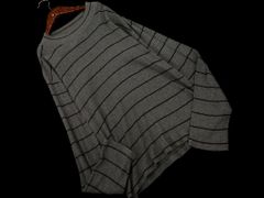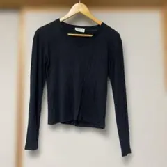ネイビーとホワイトのストライプタートルネック長袖トップス。