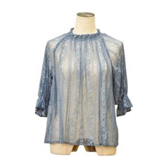 フリルとリボンが特徴的なグレーの長袖ブラウス。
