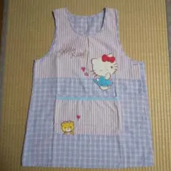 ハローキティのキャラクターがデザインされたストライプのエプロンで、前面に大きなポケットが付いています。