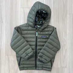 軽量で暖かいパタゴニアのダウンコート、フード付きで冬に最適。
