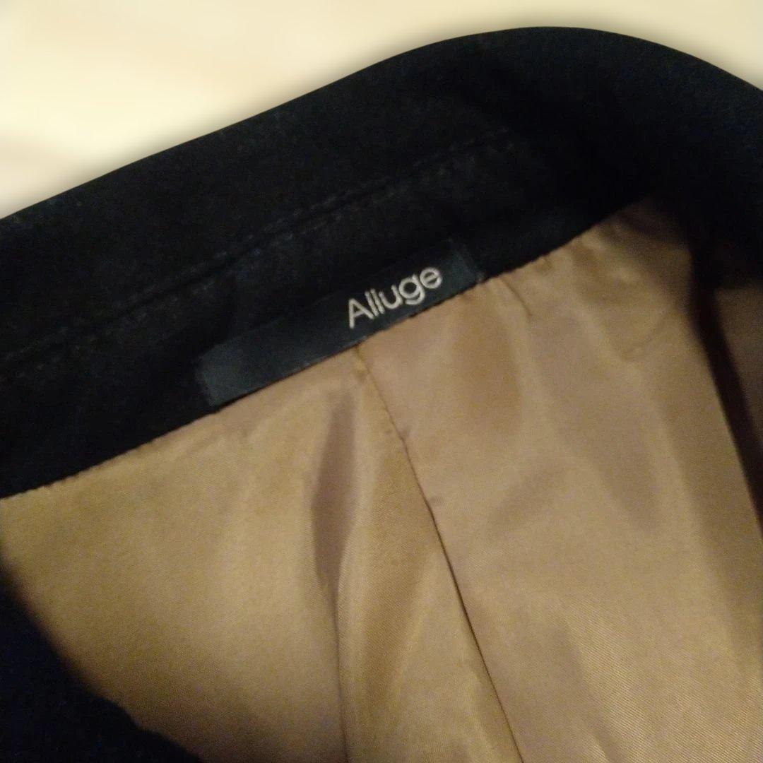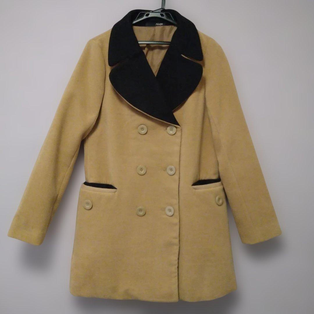 フリース風のベージュダブルブレストコート、黒い襟が特徴。