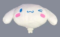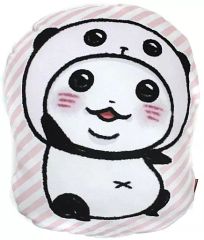 パンダの顔をモチーフにした柔らかいクッション、円筒形でストライプデザイン。