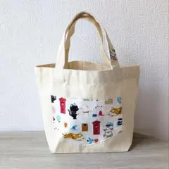 トートバッグ 猫柄 ベージュ 手提げ 肩掛け 帆布 エコバッグ 韓国 <F01>