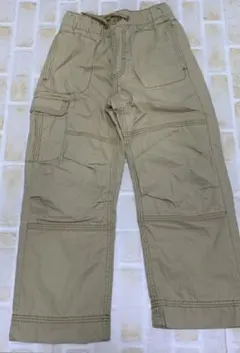カーキカーゴパンツ、サイドポケット付きで実用的。