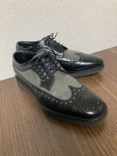 ブラックレザーのウィングチップドレスシューズ、パーフォレーションデザインでエレガント。