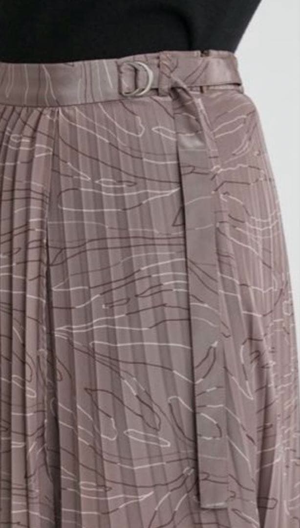 上品な線画タッチのニュアンス柄をあしらったプリーツスカート。中段の切り替えから裾にかけて広がるフレアがメリハリのあるシルエットを醸し、大人の雰囲気に仕上げました。ウエスト部分はトップスをINした際もバランス良く見えるよう、フロントはフラットに、バックのみゴムを入れ、ストレスフリーな穿き心地に。ラップ風のデザインを採用することで軽さのあるルックスに仕上がりました。