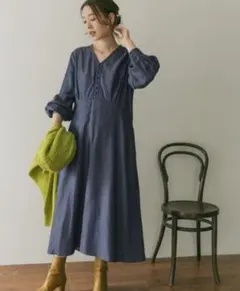 ダークブルーのプリーツデザイン長袖ワンピース、フリーサイズ、リボン付きウエスト。