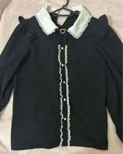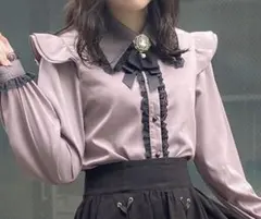 フリルとレースの装飾が特徴的な黒の長袖ブラウス。