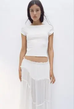 H&M DIVIDEDの黒の半袖Tシャツです。シンプルなデザインで、クロップド丈が特徴です。カジュアルなスタイルに合わせやすい一枚です。