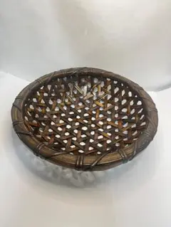 この竹の円形の籠は、黒と赤のツートンカラーの和紙を専用の糊で貼り、編まれた質感が特徴的です。竹ならでは 浮き彫りの編みが味のある 日本らしい珍しいお品です