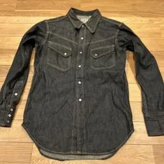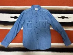 デニムブルーの長袖シャツ、フロントポケットとスナップボタン付き。