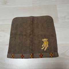 ホワイトの水玉模様にピンクの犬の刺繍が施されたコットン製ハンカチ。