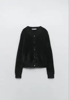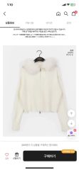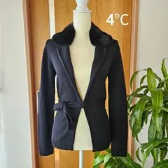 ファー付きのグレーのカーディガン、木製ボタン付きでスタイリッシュ。同素材ベルト付き。