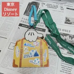 ミッキーマウスの顔デザインのパスケース、合成皮革製、青色ストラップ付き。