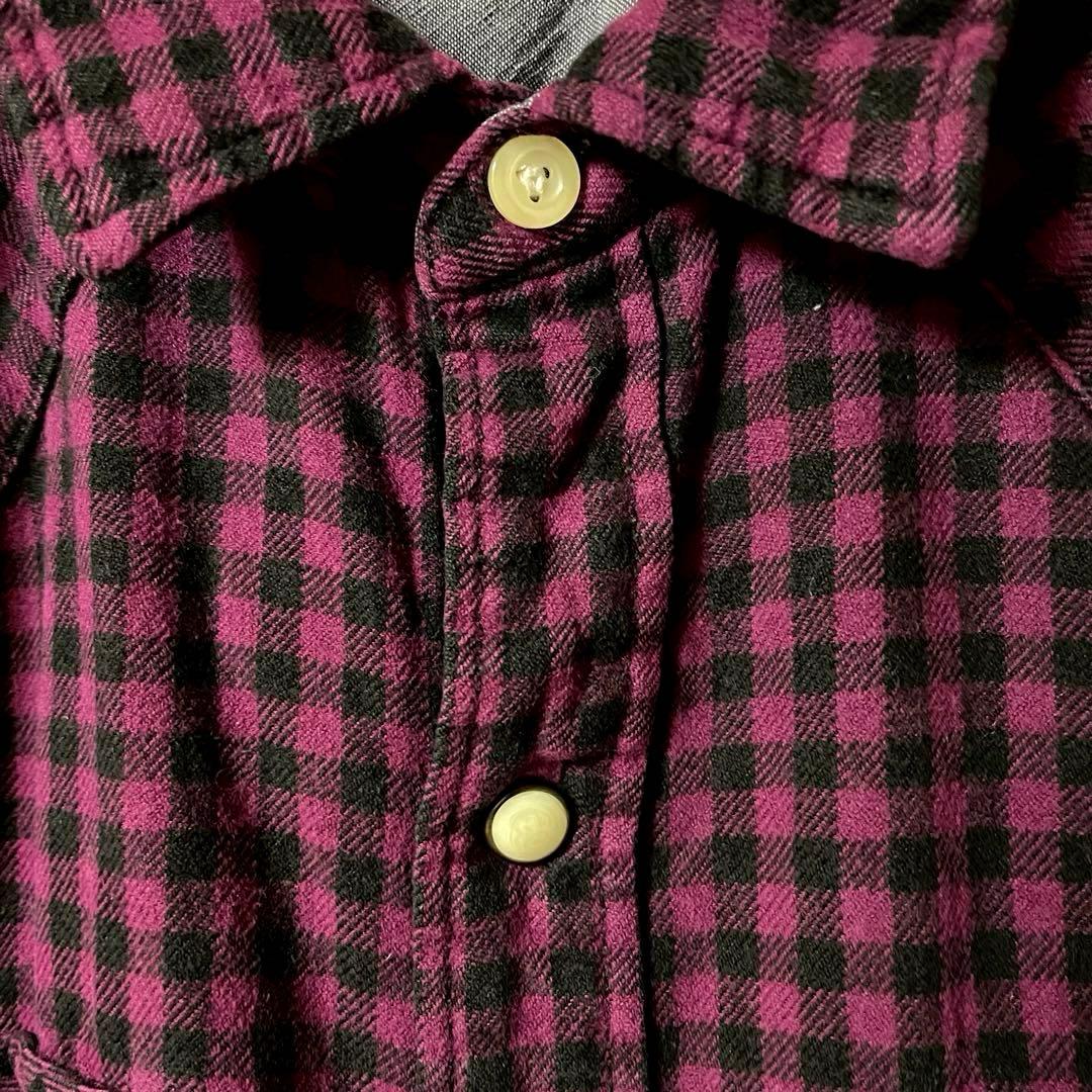 パープル系のチェック柄ネルシャツで、フロントに2つのポケットが付いています。