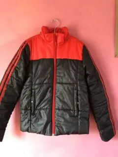 フード付きのadidasダウンコート、黒とオレンジの配色で、130サイズ。