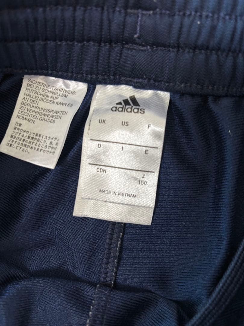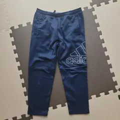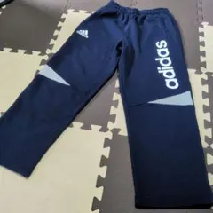 ネイビーのadidasトレーニングパンツ、150サイズ、3本ラインデザイン。