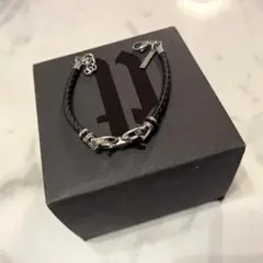 ブラックレザーとシルバー金属の文字入りブレスレット。