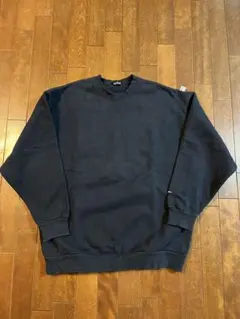 ネイビーのトレーナー、フロントにロゴ刺繍、バックにグラフィックプリント。